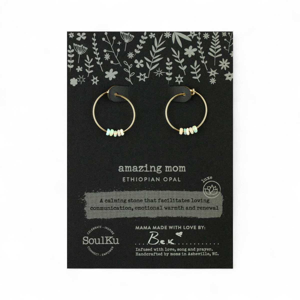 Gold hoop earrings featuring spectacular Ethiopian Opal—a calming stone that facilitates loving communication, emotional warmth, and renewal. These beautiful energies remind us of our moms and the sacred journey of motherhood.