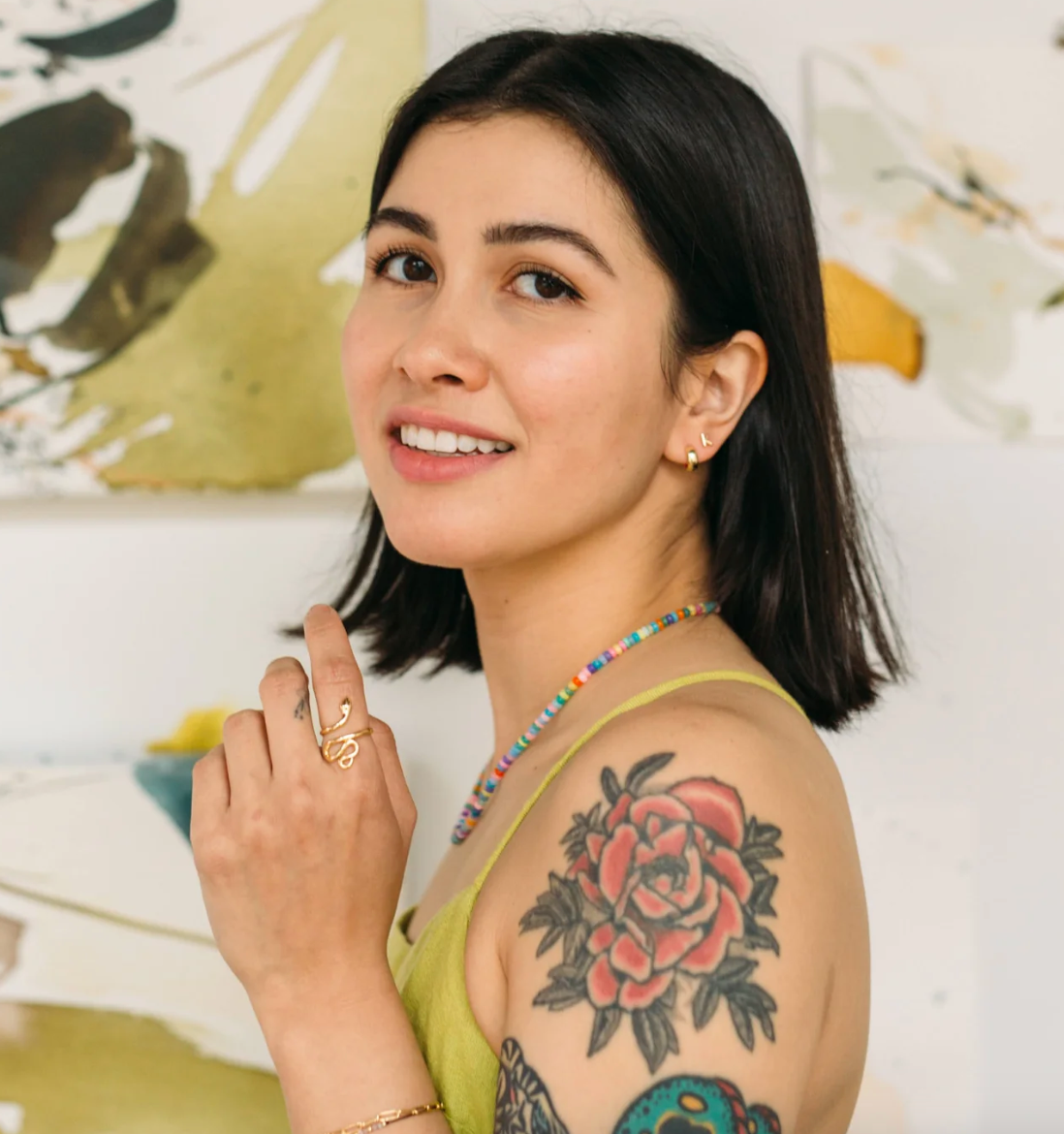 A comfortable and charming snake coils around your finger. One size fits most, as this ring is adjustable and can be easily pinched and squeezed to open/close. 18KT gold-plated brass. Please remove when showering and working-out to preserve the color.