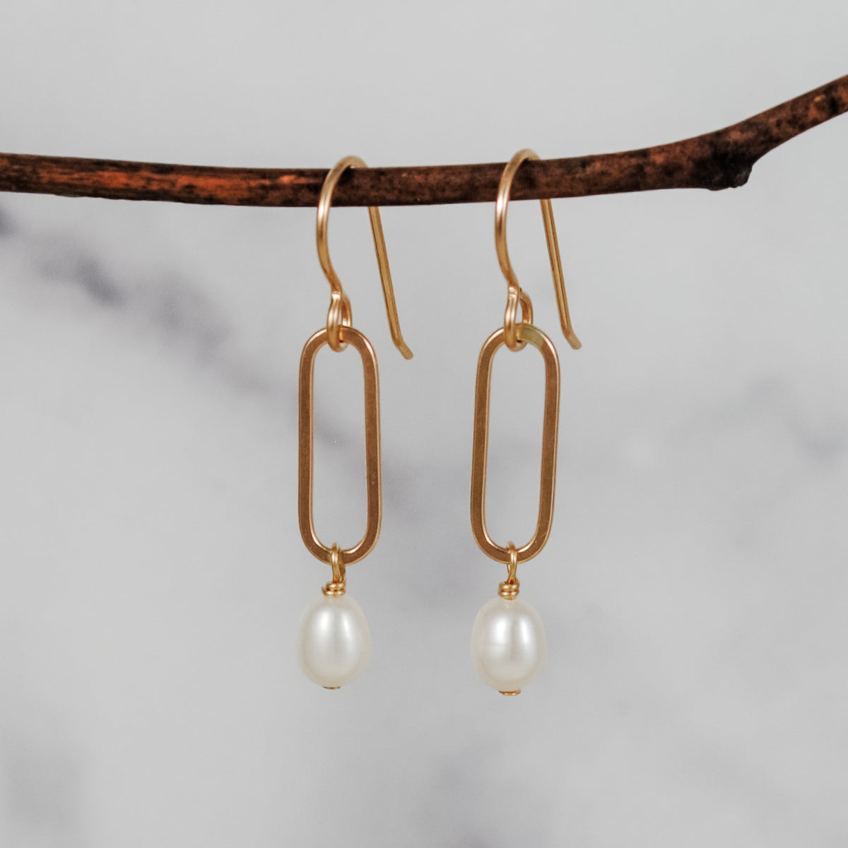 I love pearls but try to mix them into my designs in unique and modern ways. These earrings are delicate, simple, and sweet, but definitely not boring. The real freshwater pearl is suspended from a paperclip shaped link. Making them the perfect unique earring to wear with your new paperclip chain! These earrings can go with so much without being "matchy-matchy". If you prefer a different pearl color, please let me know!