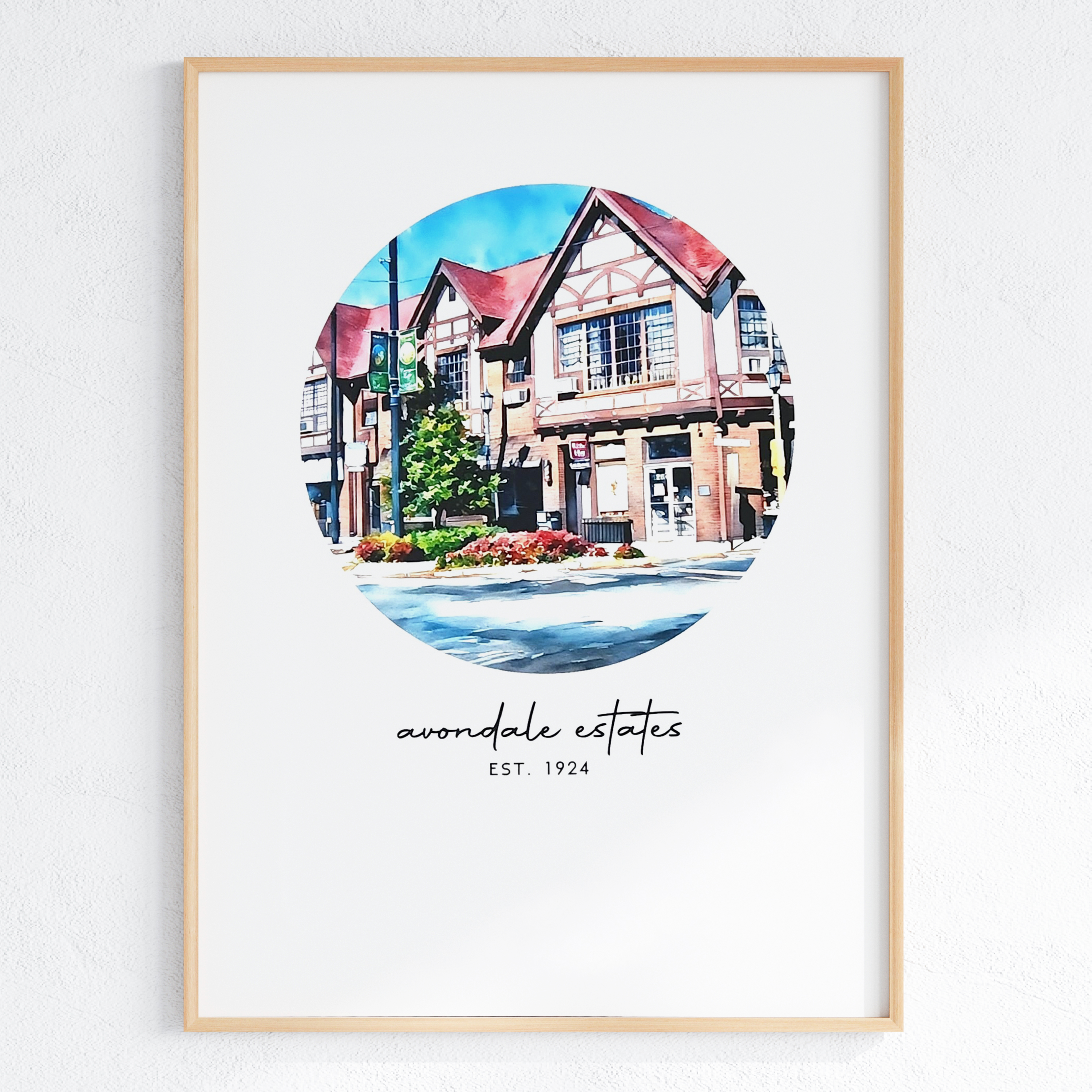 Your featured neighborhood is Avondale Estates (featuring a rending of downtown Avondale Estates, featuring their famous Tudor-style shops and restaurants). Shown in an 8.5 x 11 frame, with no mat.