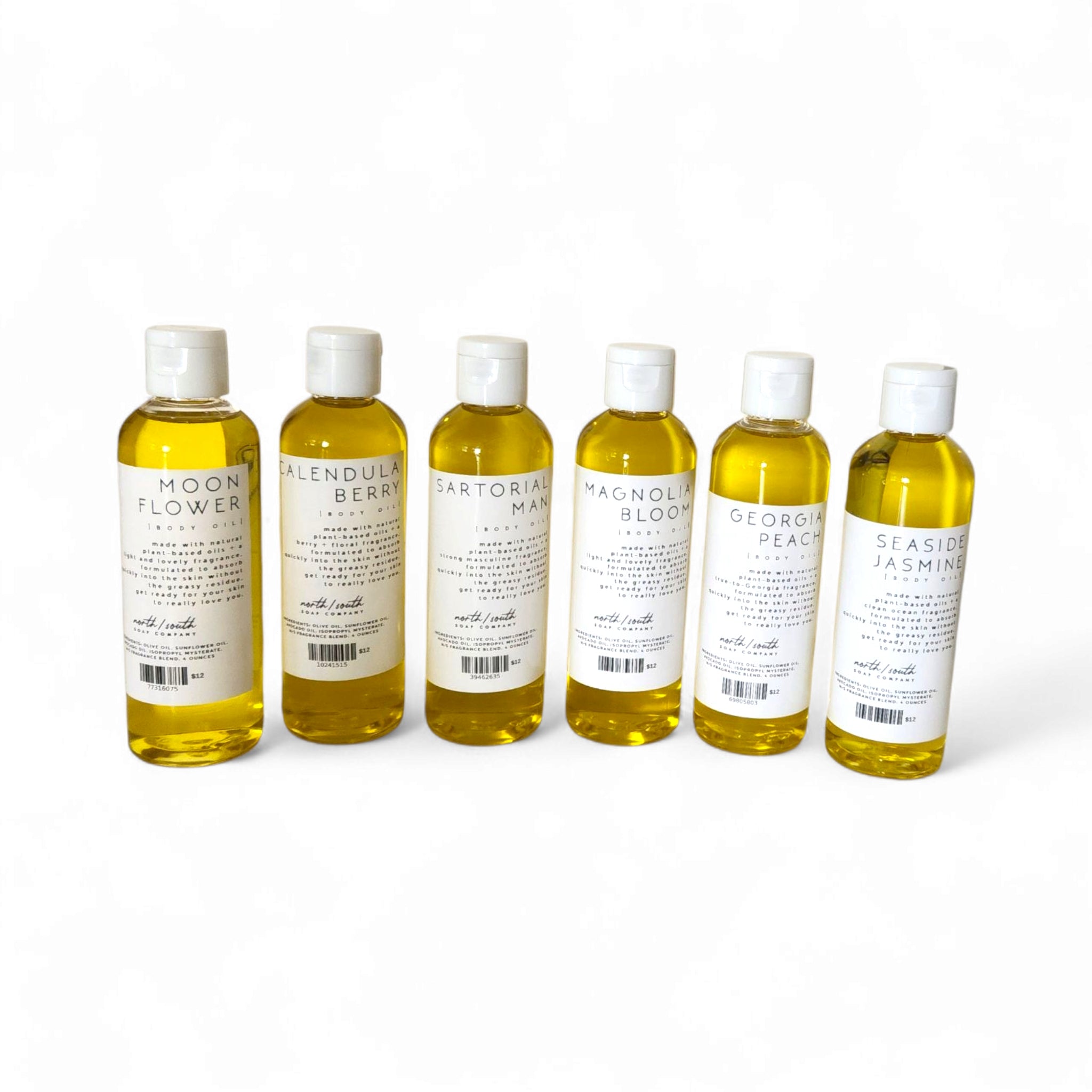 Ingredients: Sunflower oil, olive oil, avocado oil, isopropyl myristate, special N/S Soap Co fragrance blend. 4 ounce bottle with a flip top.
