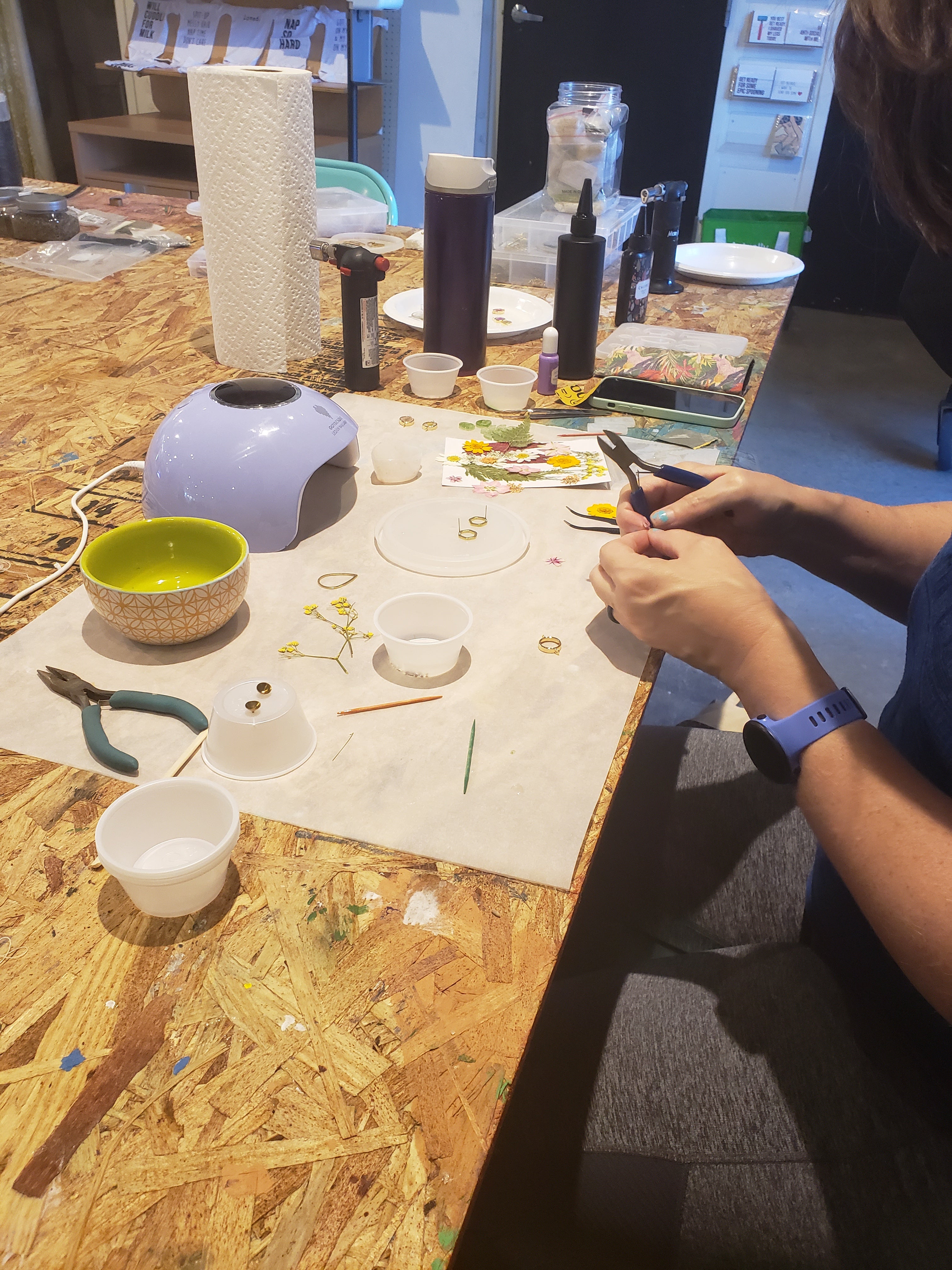 In our our UV Resin workshop, we use specialized UV resin and cure under the light in 5 minutes (so get ready to wear your work instantly!).